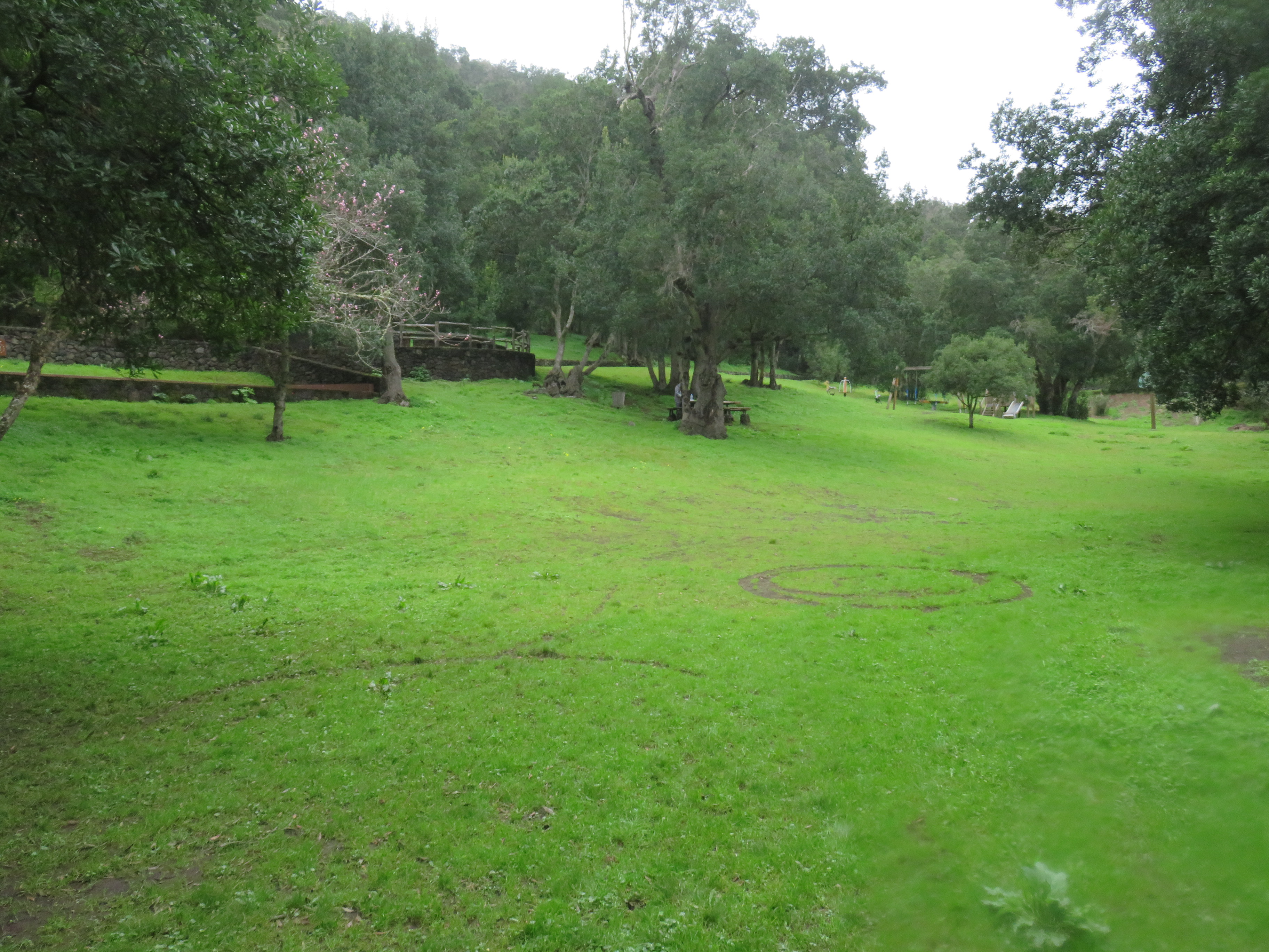 Después este bosque de fayas y brezos pasa a ser sustituido por uno de pino canario en el bailadero de las brujas para poco después reaparecer el brezo según ascendemos por lo que parece un cono volcánico hasta llegar al mirador de Fileba pero….no conseguimos ver nada privándonos de disfrutar de un paisaje geológico de interés ya que debe ser un cráter. Una densa niebla nos rodea y no deja de acompañarnos en nuestro ascenso hasta el mirador de la Llanía, donde tampoco podemos ver nada.